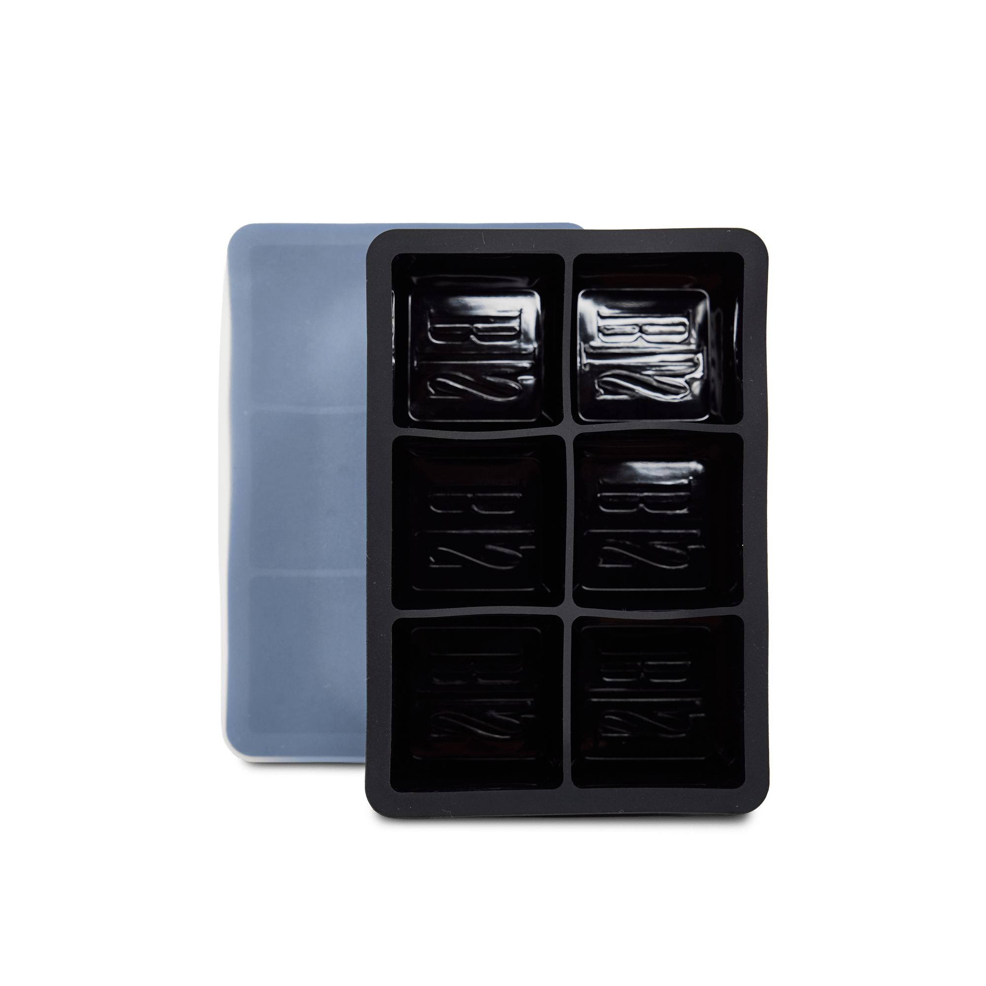 Ice cube tray with space for 6 ice cubes. Each mold features an engraved BLS logo at the bottom, making the logo clearly visible in the ice cube once frozen.